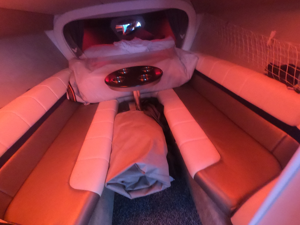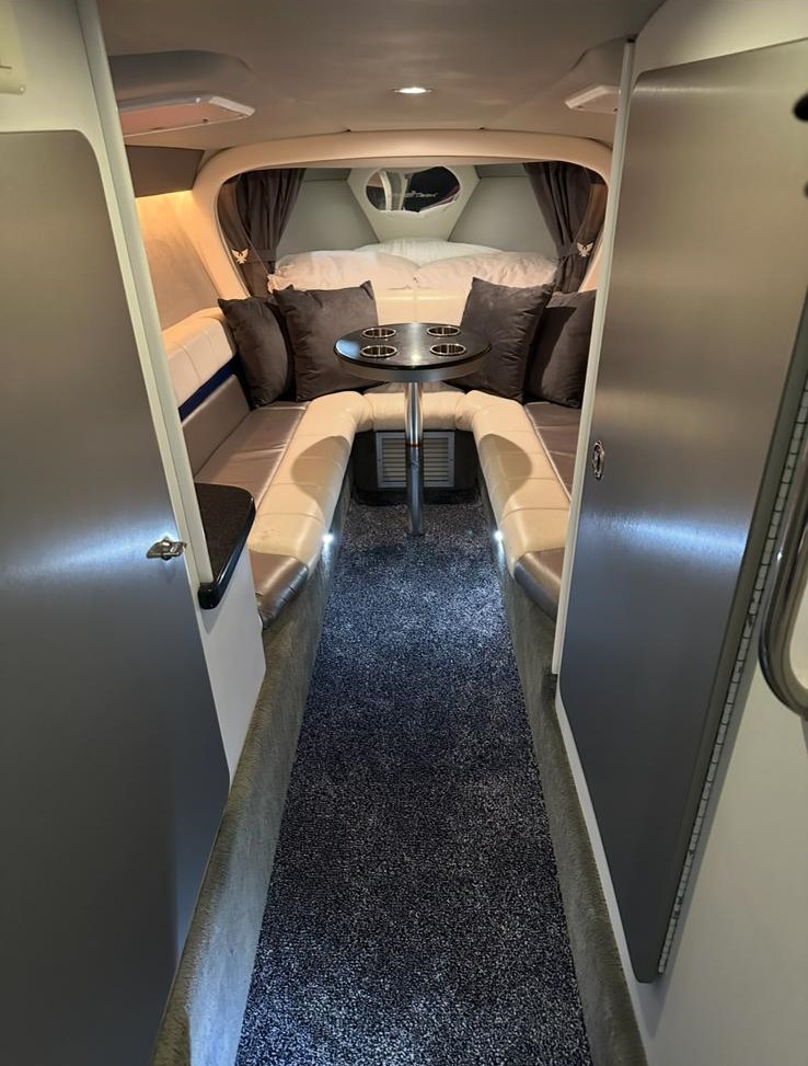 Interior features a galley cabinet to port, a head to starboard, two sofas that convert to a double bed, and a V-shaped double bed forward.